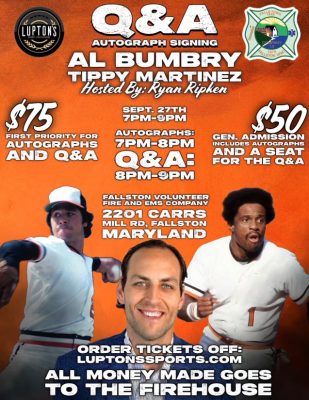 Come on out for a Q&A and autograph session featuring Orioles greats Al Bumbry and Tippy Martinez, hosted by Ryan Ripken! All proceeds from this event will benefit the FVFAC general fund