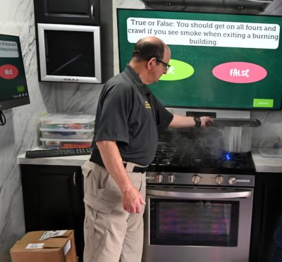 The mobile unit is outfitted inside like a home—but with the newest technological components to teach household fire safety, including touch screens, a heated door and water-based smoke to simulate a fire, and a sample fire alarm pull station.